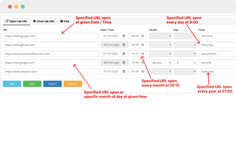 يدعم الملحق مجموعة متنوعة من خيارات الجدولة، مما يسمح بتعيين علامات التبويب لفتحها أو إغلاقها مرة واحدة أو تكرارها على فترات تتراوح من دقائق إلى أشهر. يمكن للمستخدمين أيضًا استيراد وتصدير جداول علامات التبويب الخاصة بهم باستخدام تنسيق CSV، مما يسهل عملية إدارة عناوين URL المتعددة. بشكل عام، يعمل جدول علامات التبويب كأداة قوية لتعزيز الإنتاجية والتنظيم أثناء التصفح.